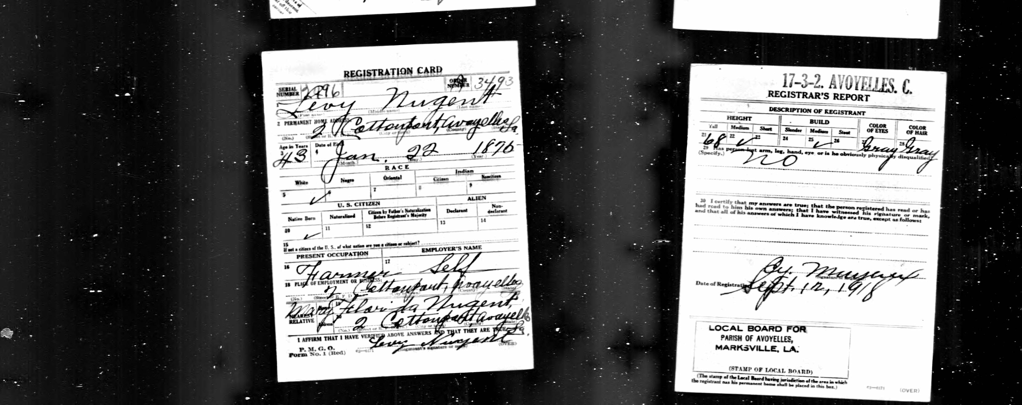 Levy Nugent was born 22 Feb 1875 in Bayou Jack, Louisiana in Avoyelles Parish. On 8 Jan 1895, he married Florida Marie Charrier at Mater Dolorosa Catholic Church in Plaucheville, Louisiana (Avoyelles Parish). Levy was drafted for WWI on 12 Sep 1918 at the age of 43. Florida was born 20 Feb 1877. Levy died 1 Apr 1933 and Florida died 23 Sep 1945; both are buried at Mater Dolorosa Catholic Church Cemetery in Plaucheville, Louisiana along with four of their eleven children. I found this information about Levy & Florida's wedding: